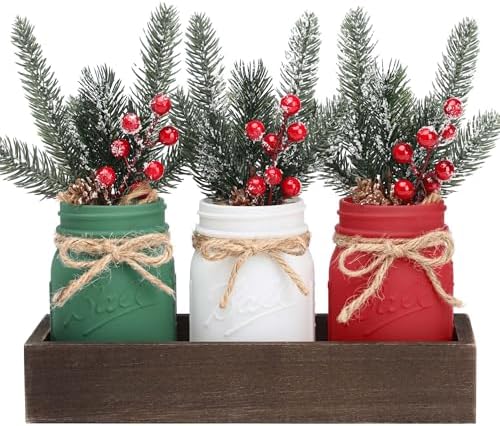 Winter Mason Jar Centerpiece Set 3 Painted Jars with Wood Tray for Christmas Table Decor