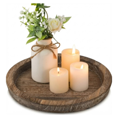 Round Wood Candle Tray – Rustic Farmhouse Centerpiece Plate Holder