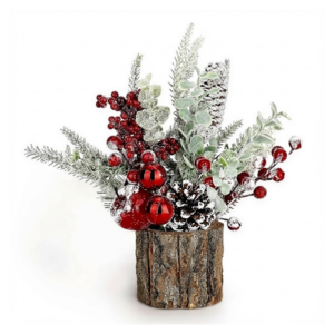 Mini Christmas Tree Tabletop – Small Artificial Tree with Red Berries Pine Cones Wood Base