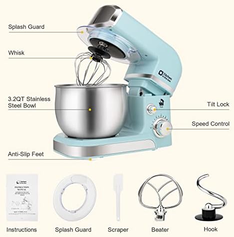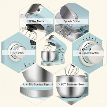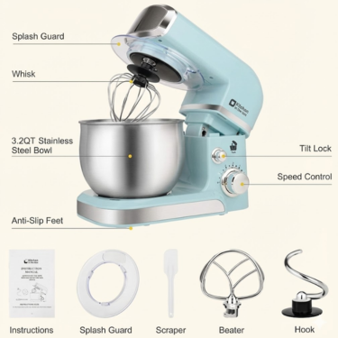 Includes a durable 3.2-quart stainless steel bowl, perfect for small batches of dough, cake batter, cookies, frosting, and daily baking needs.6-Speed Motor for Precise Mixing Control