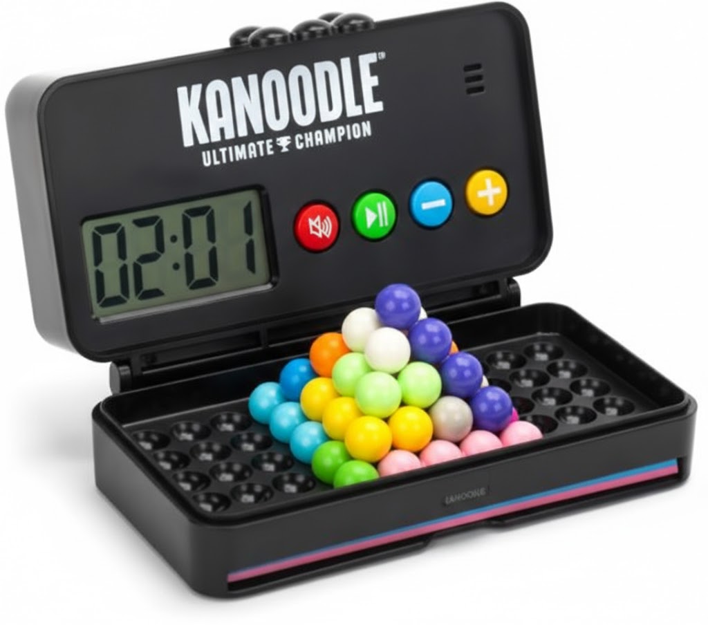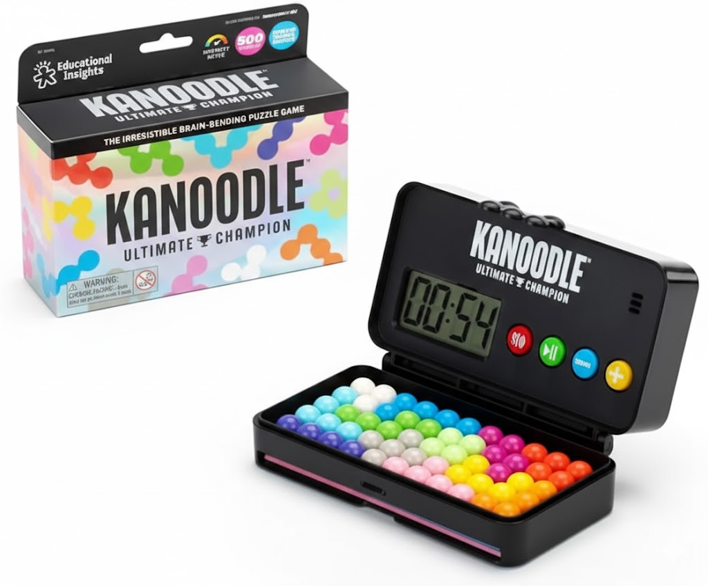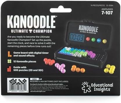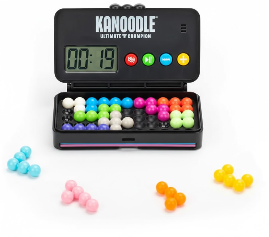 This advanced edition of the classic Kanoodle series introduces a timed element to the traditional 2D and 3D puzzle format. Designed for portable use, the sleek black console houses all puzzle pieces and a digital display, making it an ideal choice for travel and focused mental exercise.