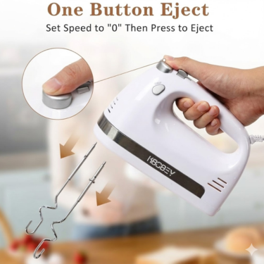 Includes storage case for 2 beaters and 2 dough hooks, plus one-touch eject button for mess-free swaps. Ergonomic grip reduces fatigue; corded for instant readiness.