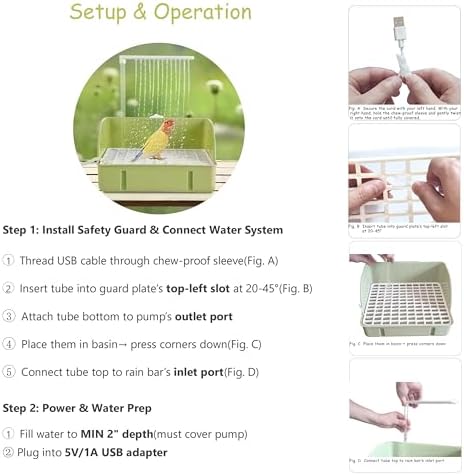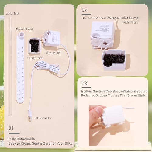 Auto-Circulating Water: Quiet 5V pump (<30dB) runs 8+ hours on triple filtration to prevent clogs energy-efficient and stress-free for birds.