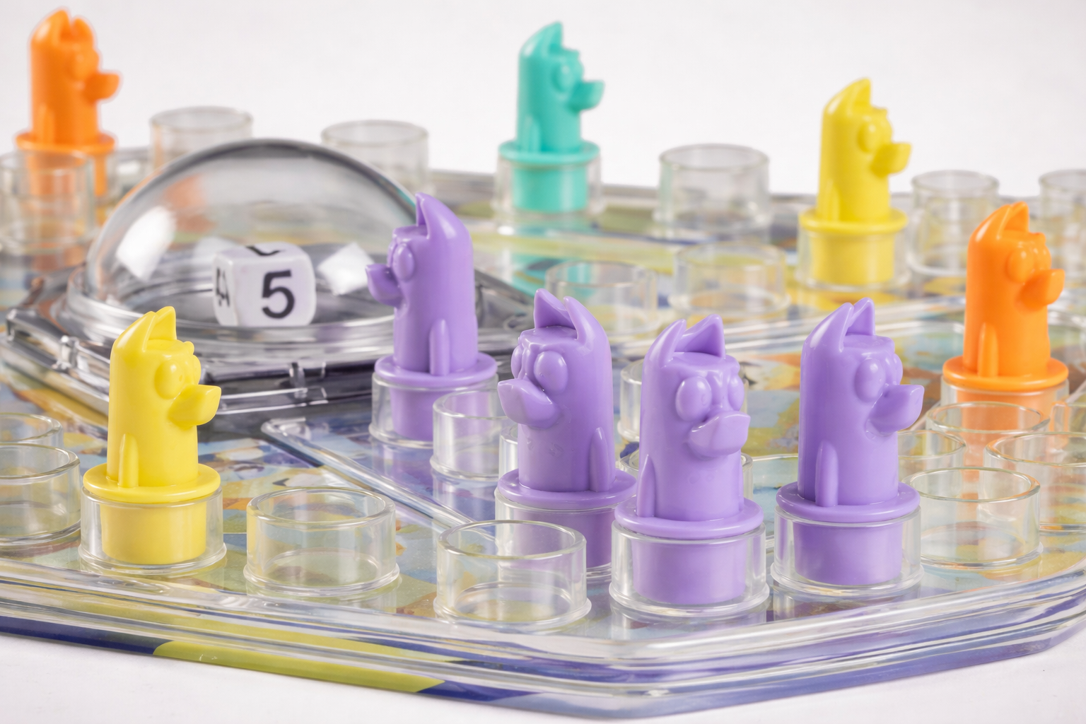 The core mechanic utilizes the traditional Pop-O-Matic dice roller, keeping game components contained during use. Players select from four character tokens Bluey, Bingo, Chilli, and Bandit to navigate the board. The mechanics remain true to the original game format, ensuring consistency for players familiar with the classic rules, while the theme provides an engaging experience for young fans.