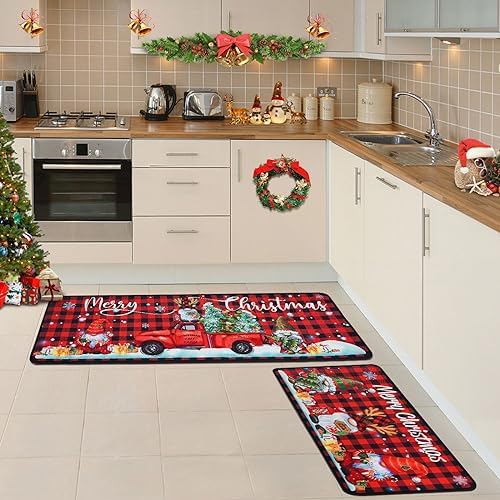Christmas Kitchen Mats Set of 2 Red Black Buffalo Plaid with Gnome Truck Design