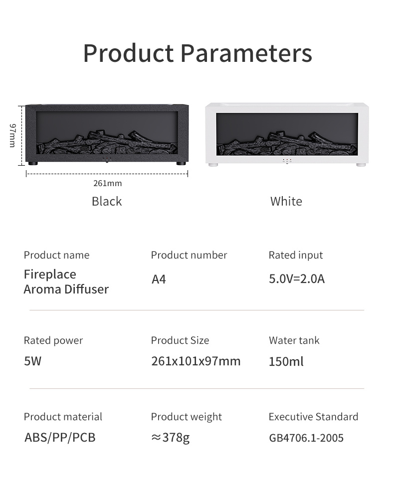 Compact at 261x101x97mm and available in white or black, this 5W USB-powered unit (5V/2A) holds 150ml water for 20-25ml/h mist output. Enjoy remote control for atomization, colorful lights, timers (1/3/5H), and standalone fireplace mode that auto-shuts after 8H. Safety features include water-shortage protection. Weighing just 600g, it includes host, remote, Type-C cord, and multi-language manual perfect for home, office, or bedroom use by adults seeking cozy ambiance.