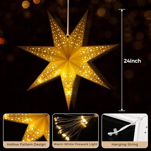 LED Star Lantern Christmas Decoration 24 Inch Paper Star with 60 LED Lights, 8 Modes, Remote Control for Indoor Outdoor Holiday Party Wedding Decor