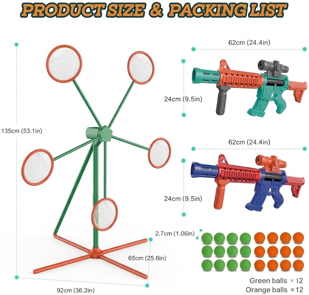 Constructed from durable, high-impact ABS plastic, the target stand is engineered for stability during play. The blasters are lightweight and ergonomically designed for younger users, while the projectiles consist of soft, lightweight foam designed for safe impact.