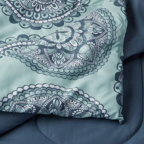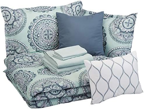 Transform your bedroom with the Amazon Basics 10-Piece Bed-in-a-Bag Queen set in soothing sea foam medallion floral print. This complete bedding ensemble includes a 90 x 90-inch comforter, 90 x 102-inch flat sheet, 60 x 80 x 14-inch fitted sheet, two 20 x 26-inch shams, two 20 x 30-inch pillowcases, a 60 x 80 x 16-inch bedskirt, one 12 x 16-inch rectangle pillow, and one 16 x 16-inch square pillow (pillows not included).