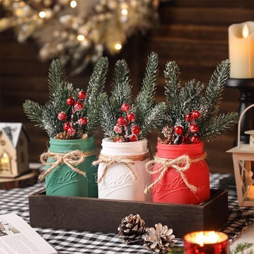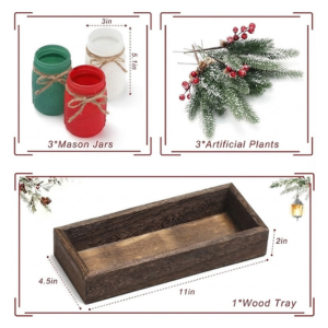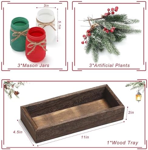 Winter Mason Jar Centerpiece Set 3 Painted Jars with Wood Tray for Christmas Table Decor