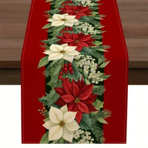 Christmas Poinsettia Berry Printed Table Runner 2D Flat Print FestiveDecor Christmas Dining Table Decoration Elegant Charming